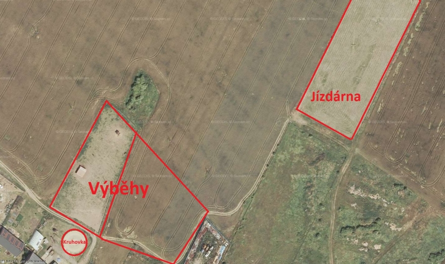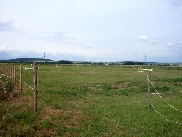 Travnatá jízdárna s rozměry 125x55m + skokový materiál